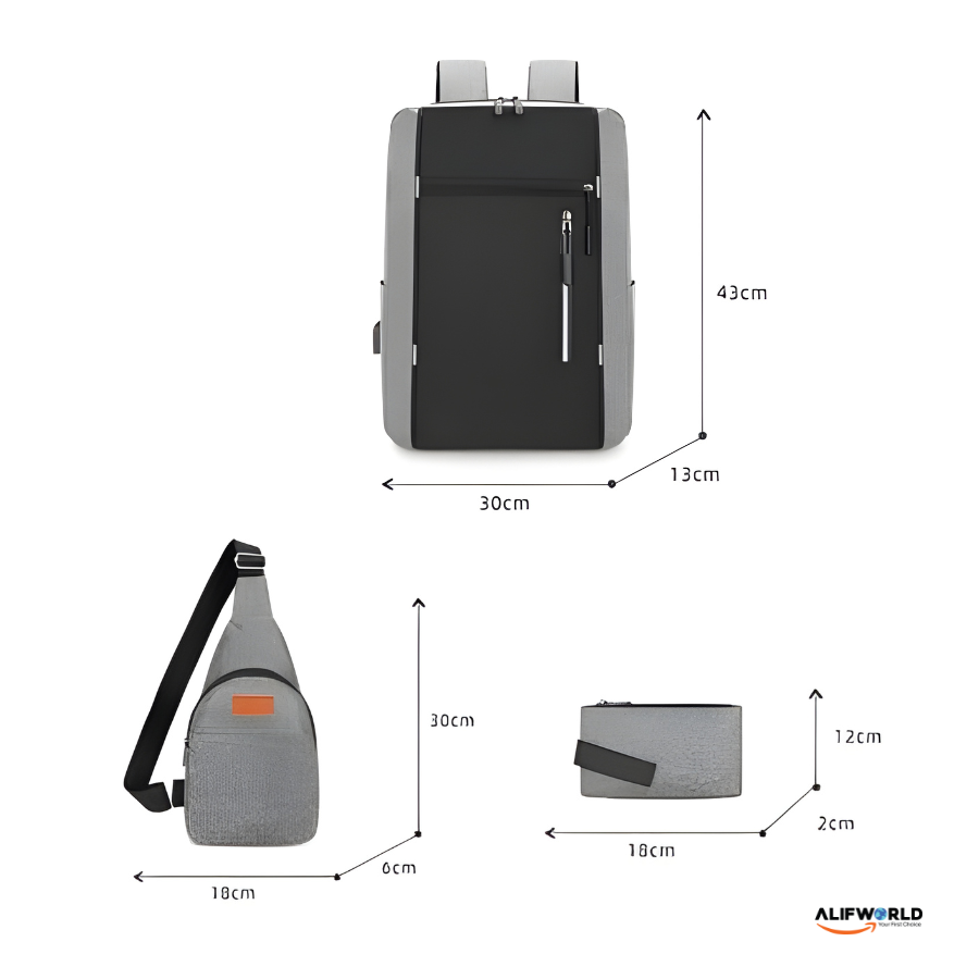 This 3 in 1 backpack set is designed for daily school college office and travel use in Bangladesh. The main backpack includes a dedicated laptop compartment and multiple organized chambers for books clothes mobile and essentials ensuring comfort and smart storage. Made with durable waterproof material this set offers long lasting use with a premium quality build suitable for regular heavy use.